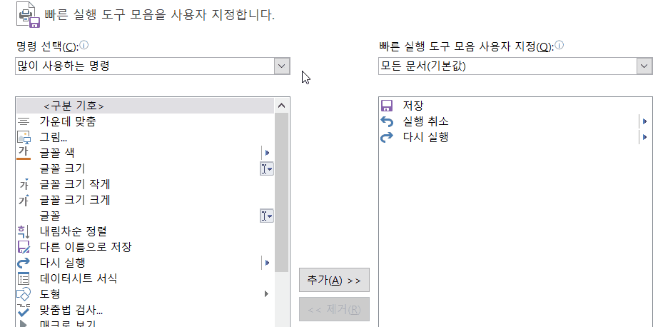 [빠른 실행 도구 모음] 기능을 통해 다른 기능도 지정해두고 사용하시면