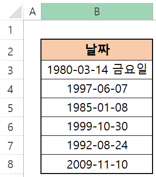 셀 서식을 설정한 B3 셀의 끝에 "금요일" 이라는 값이 새로 생겨났죠?