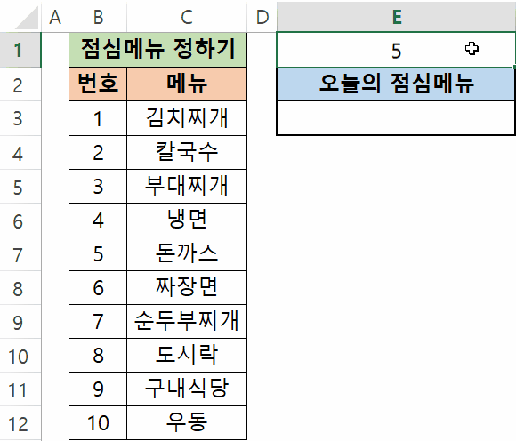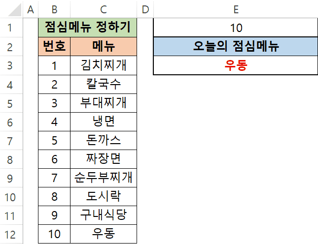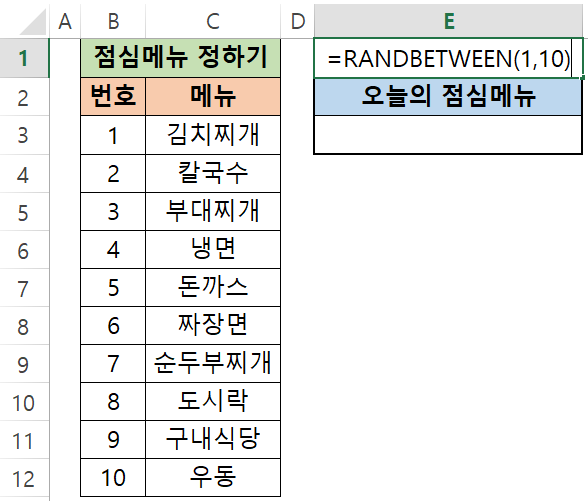 B3:C12 : 점심메뉴를 나열해놓은 데이터 범위를 선택 (자동채우기가 필요 없기 때문에 달러($) 표시는 쓰지 않았습니다)
