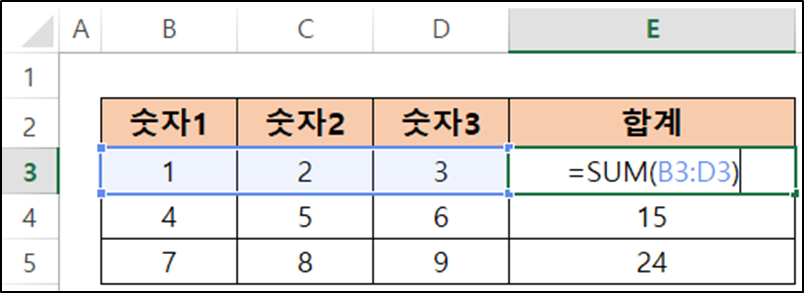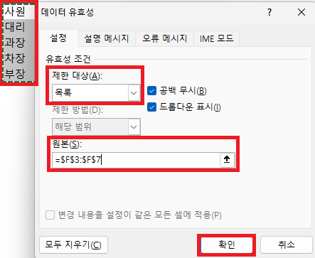 예: F3:A7에 사원 / 대리 / 과장 / 차장 / 부장 입력