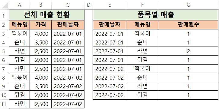 저기서 특정 메뉴별 판매 횟수를 COUNTIF 함수를 이용해서 한번 세보겠습니다.